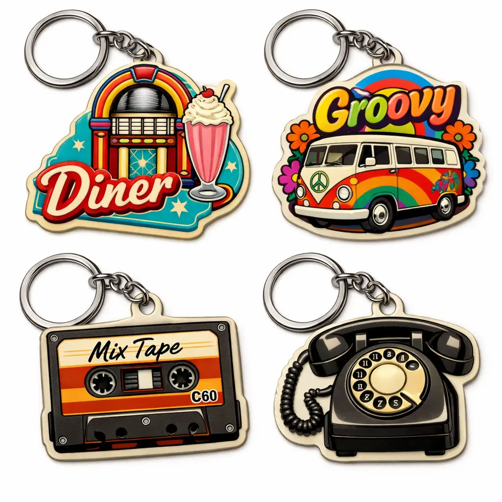 1970s-inspired designs embrace earthy tones, groovy patterns, and bohemian motifs. Create keychains featuring peace symbols, VW buses, or stylized flowers with psychedelic color treatments. The decade’s characteristic rainbow gradients and bubble letters add authentic period flavor to these nostalgia-driven concepts.
