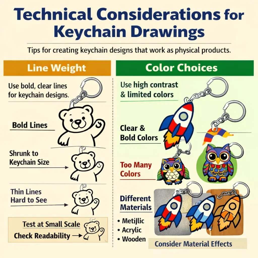 Beyond creative concepts, successful keychain drawings require attention to technical factors affecting production and usability. Understanding these practical considerations helps create designs that translate effectively from sketch to physical product.
