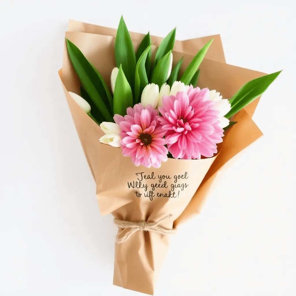 Sometimes the simplest combinations produce the most striking results. A double layer of plain brown paper finished with a piece of natural jute twine creates a minimalist presentation that lets the flowers stand entirely on their own merits. This approach is particularly suited to single-variety bouquets where the goal is to spotlight one bloom, such as a generous handful of white tulips or a cluster of bright dahlias. Write a short personal message directly on the paper using a black marker or stamp to add a personalized touch without the need for an additional gift card.