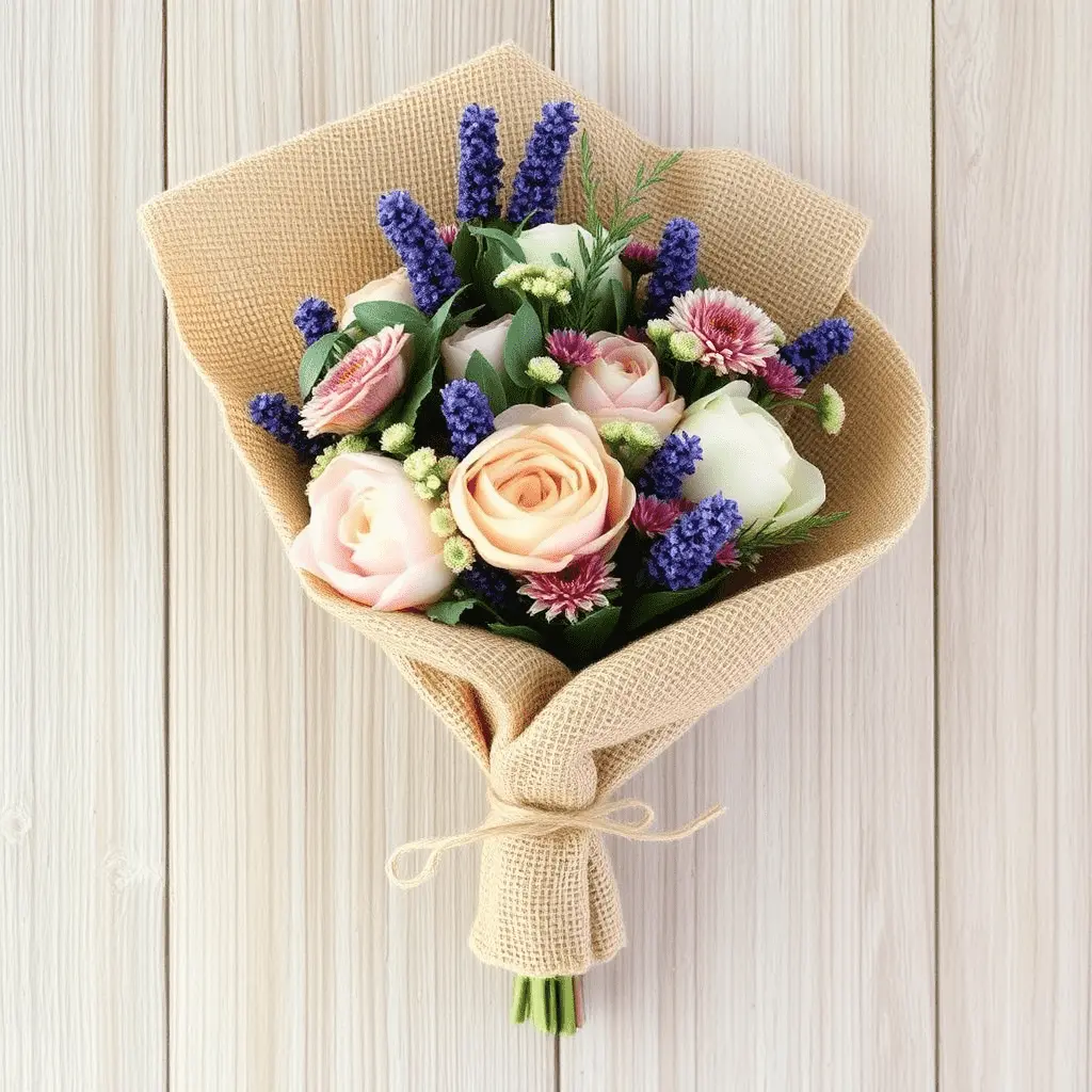 Burlap has earned its place as a staple in the world of rustic and farmhouse-style floral design. Its rough, natural texture creates a wonderful contrast against soft, delicate petals. Cut a generous rectangle of burlap fabric, place your bouquet at one end, and roll it loosely so that the blooms sit comfortably at the top. Fold any excess material at the base and secure it with a piece of jute twine or a thick ribbon. Burlap works especially well for barn weddings, garden parties, and earthy-toned arrangements featuring lavender, eucalyptus, or peony varieties.