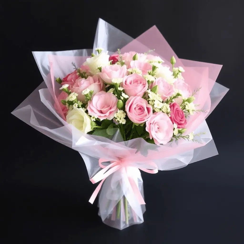 Cellophane remains a classic for a reason. Its transparent nature allows the full beauty of the flowers to remain visible while still providing a polished, professional presentation. Cut a wide sheet of cellophane, gather it around the bouquet, and cinch it tightly at the stem point with a ribbon. For an upgraded version, layer two sheets of cellophane in complementary tinted shades, such as blush pink over white, to add depth and a dreamy quality to the presentation. Cellophane also protects delicate petals during transport, making it especially practical for gifting.