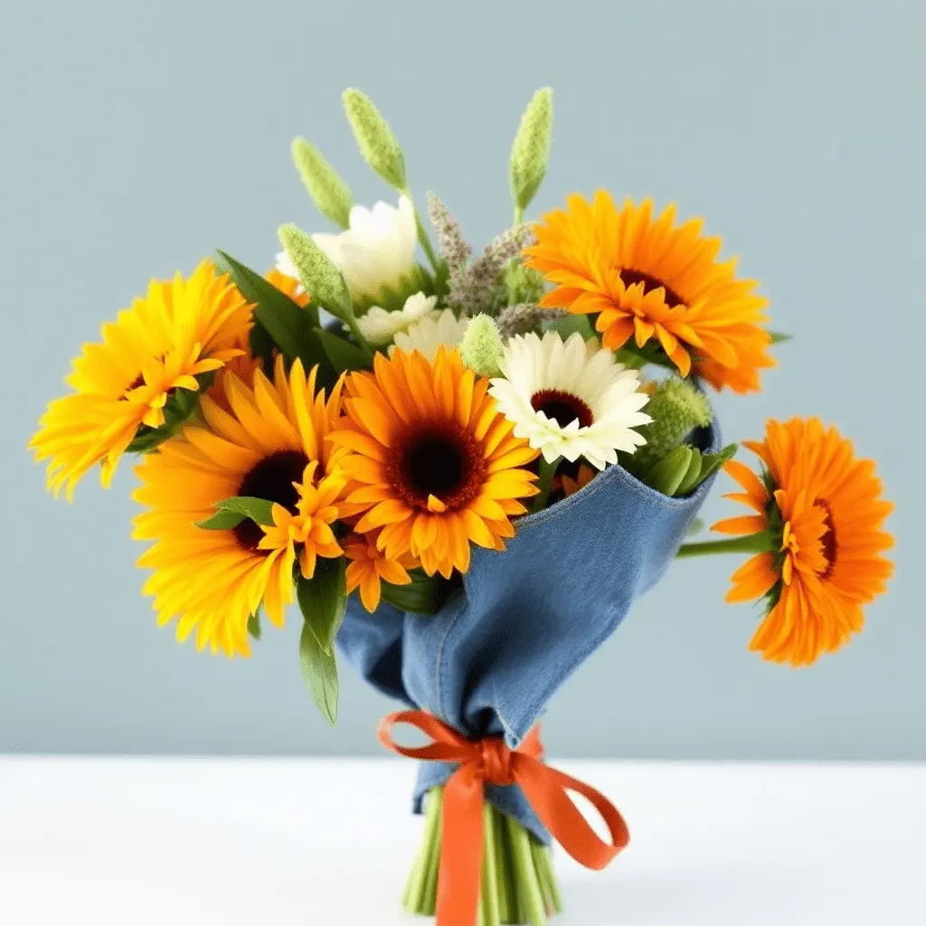 Repurposing denim fabric as a bouquet wrap is a creative, sustainable choice that gives arrangements a cool, casual personality. Cut a piece of denim from an old pair of jeans, wrap it around the lower portion of the stems, and secure it with a leather cord or a bold-colored ribbon. Denim works especially well with bold, striking flowers like sunflowers, gerbera daisies, or orange marigolds. The contrast between the rough, structured fabric and the fresh, vibrant blooms creates a visual tension that is both modern and memorable.