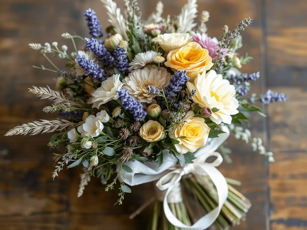 Rather than using fabric or paper as the primary wrapping material, this approach incorporates natural elements such as dried grasses, sprigs of eucalyptus, dried lavender, or feathery ferns around the exterior of the bouquet. Bind these natural accents to the outside of the stems using floral wire, then cover the wire with a length of ribbon or decorative twine. The result is a highly organic, textured presentation that blurs the line between the bouquet and its wrapping, creating something that feels more like a hand-gathered garden posy than a conventional gift arrangement.