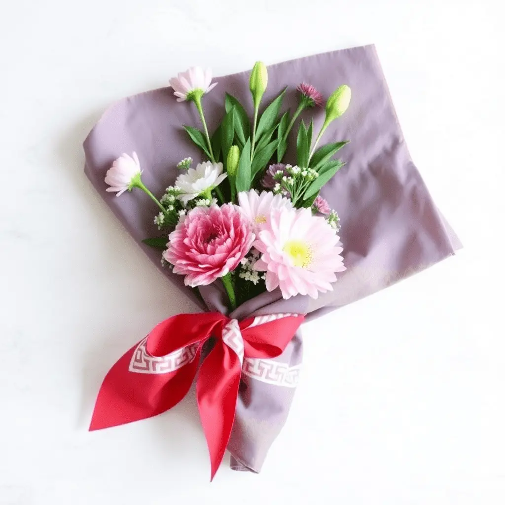 Inspired by the traditional Japanese art of furoshiki, this technique uses a square piece of fabric rather than paper. Choose a soft cotton or silk scarf in a color that complements your blooms. Lay the fabric flat, place the bouquet at its center, and bring the four corners up around the stems, tying them together in a knot at the top.