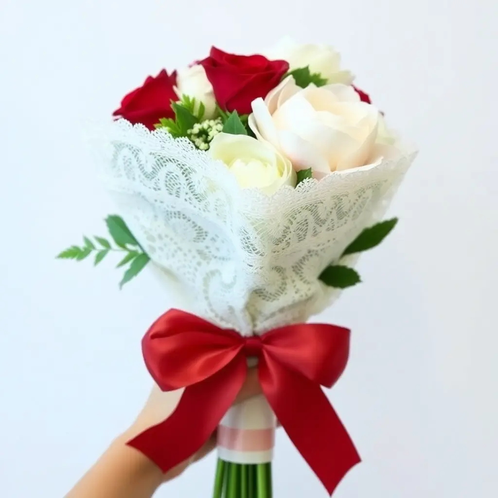 For occasions that call for romance and refinement, lace is an exceptional wrapping material. Wrap a length of lace fabric around the stems of the bouquet, overlapping it slightly as you go, and pin or tape it discreetly at the back. Layer a satin or velvet ribbon over the lace and tie it into a full, flowing bow at the front. This style is a natural match for bridal bouquets, Valentine’s Day arrangements, and anniversary gifts. Ivory lace against deep red roses is a timeless combination, while soft blush lace alongside white peonies feels effortlessly ethereal.