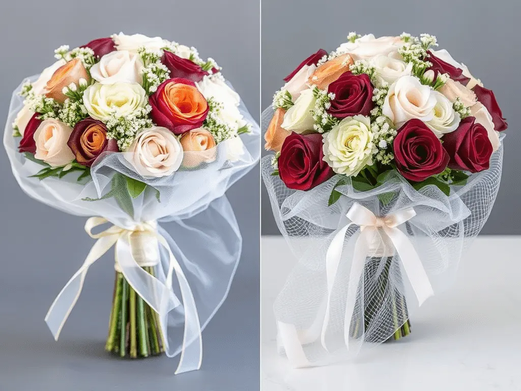 Floral mesh or netting adds a light, textured quality to bouquet presentations that feels both contemporary and elegant. Available in white, gold, silver, and various pastel shades, mesh can be gathered loosely around the stems of a bouquet and cinched with a ribbon to create a soft, cloud-like wrap. This technique works particularly well for elaborate multi-flower arrangements at weddings or formal events, where a bit of added sparkle is appropriate. Gold or silver mesh against deep burgundy roses is especially effective for autumn and winter occasions.