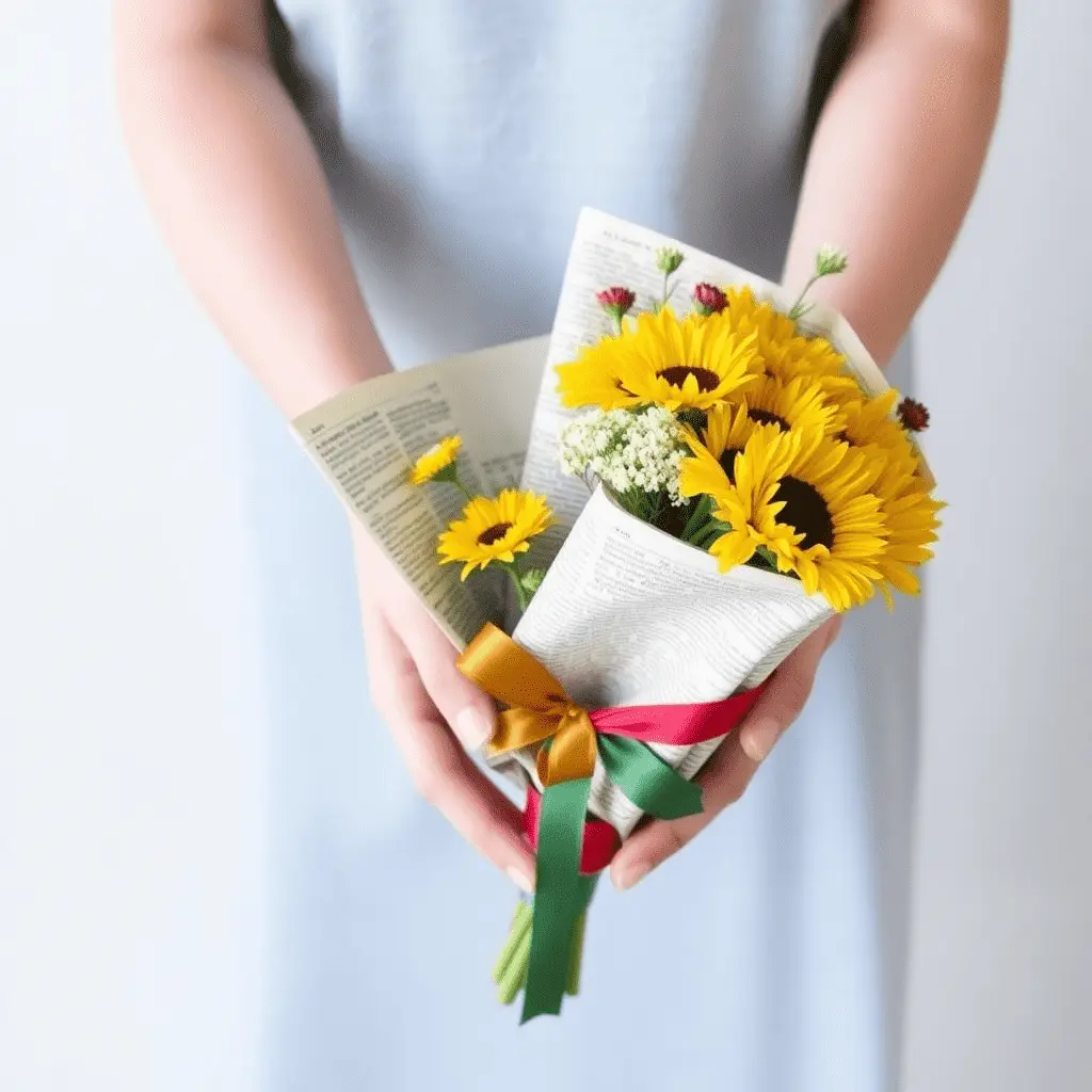 Old newspapers carry a romantic, nostalgic quality that suits certain bouquet styles perfectly. This wrap works especially well with wildflower arrangements, sunflowers, or bold-colored blooms. Simply fold a few sheets of newspaper into a wide cone, tuck the flowers inside, and secure the base with floral tape or a rubber band.
