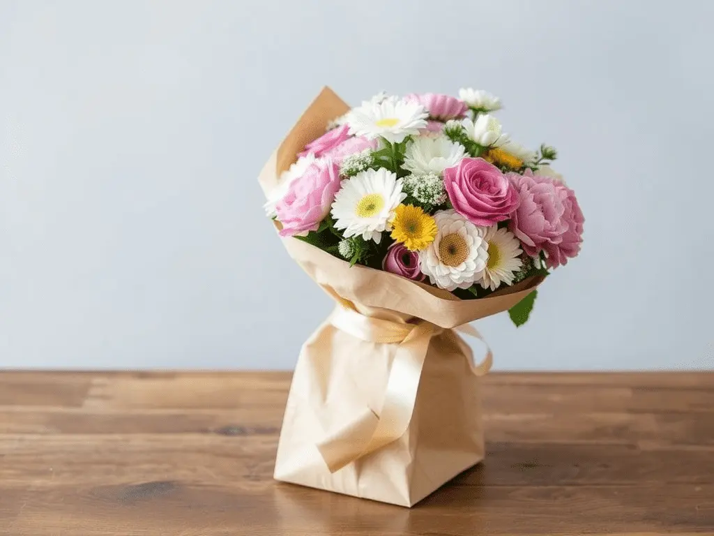 A plain paper bag transforms into a surprisingly charming bouquet wrap with minimal effort. Choose a bag with a sturdy base and a width that comfortably accommodates the bouquet stems. Fold the top edge of the bag down several times to create a neat, structured cuff. Slide the flowers in, adjust their position so the blooms fan out attractively above the bag, and tie a ribbon around the outside. This style is especially well suited to casual occasions or when you need a quick, last-minute presentation that still looks intentional and polished.