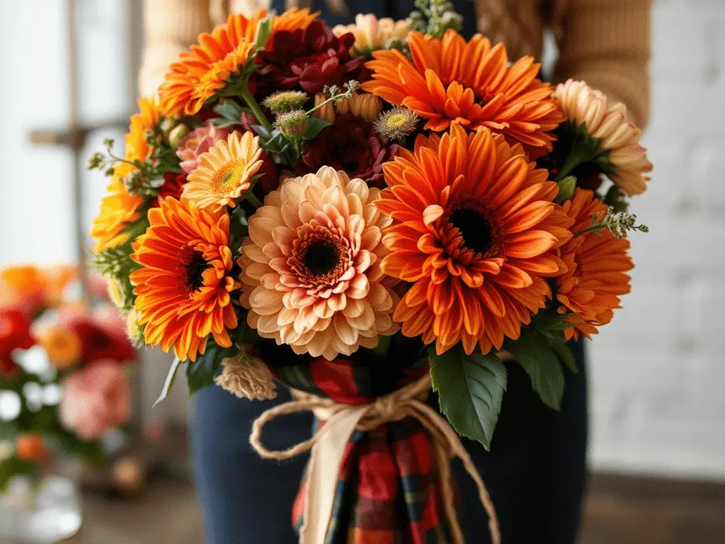 Plaid fabric brings warmth, pattern, and seasonal character to any bouquet. This wrap is especially popular during autumn and winter months, when cozy, comforting aesthetics feel most appropriate. Use a piece of plaid flannel or cotton fabric, wrap it around the lower two thirds of the bouquet, and secure it with a thick velvet ribbon or a natural raffia tie. Plaid pairs particularly well with autumn-toned flowers such as rust chrysanthemums, orange marigolds, burgundy dahlias, and deep golden sunflowers. The overall effect feels festive, inviting, and immediately personal. https://www.craftysphere.com/diy-bouquet-wrap-ideas/