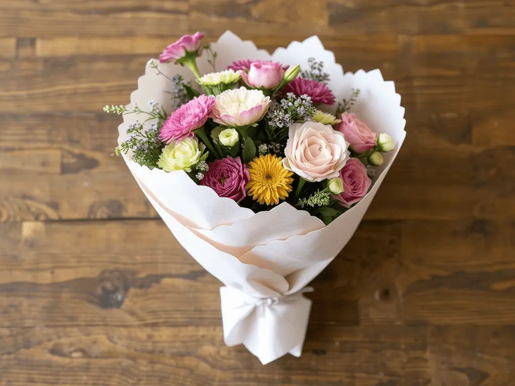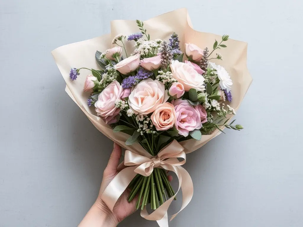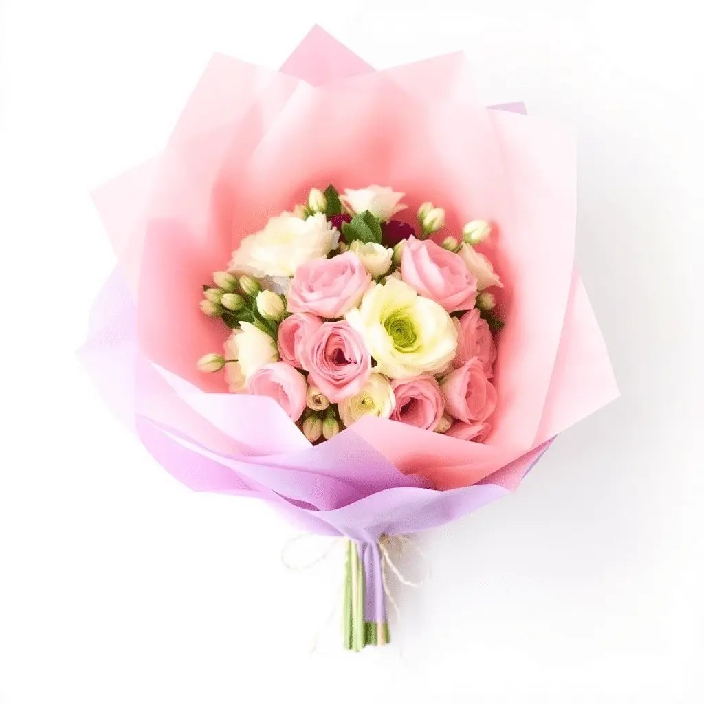 Tissue paper is one of the most affordable and versatile materials available for DIY flower wrapping. Its lightness and translucency make it ideal for layering multiple colors together to create a rich, dimensional effect. Choose two or three complementary shades, stack the sheets at slightly offset angles, and place the bouquet at the center before gathering the paper upward around the stems. Secure with ribbon or twine. Tissue paper pairs beautifully with soft pastel flowers like garden roses, sweet peas, and ranunculus, and gives the overall arrangement a delicate, gift-ready quality.