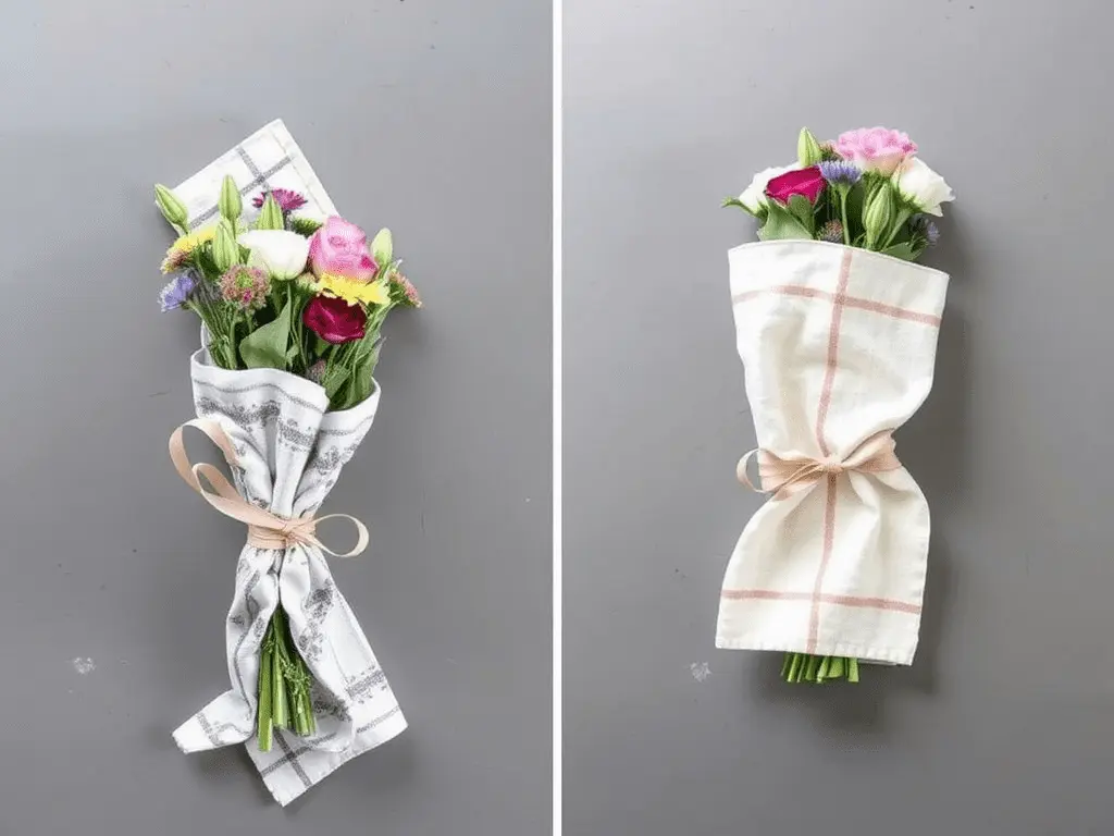 The result is an elegant, reusable wrap that doubles as a gift in itself. Recipients can use the fabric again as a scarf, a table cloth, or a decorative piece, making this one of the most thoughtful and sustainable DIY flower wrapping ideas available.
