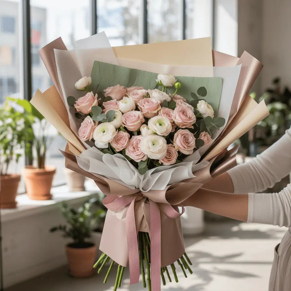 Kraft paper and tissue paper are two of the most versatile and widely available options. Both work well for a range of flower types and occasions, and they are easy to handle even for beginners.