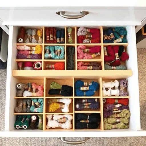 A well-organized deep drawer fitted with adjustable dividers is a wonderfully clean embroidery thread organizer solution for stitchers who prefer a tidy, hidden storage approach. Divide the drawer into sections based on thread type, assigning separate zones to cotton floss, silk, metallic, overdyed, and specialty threads.