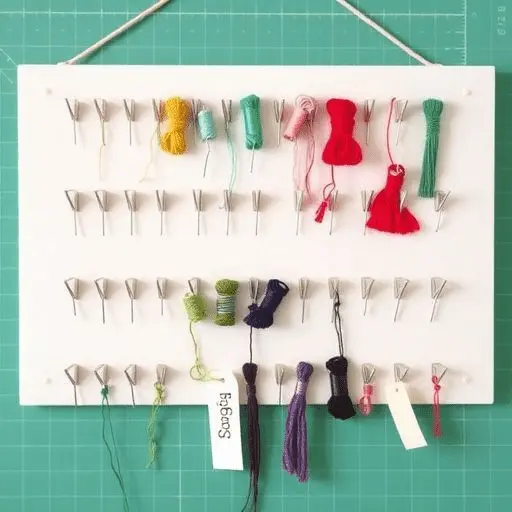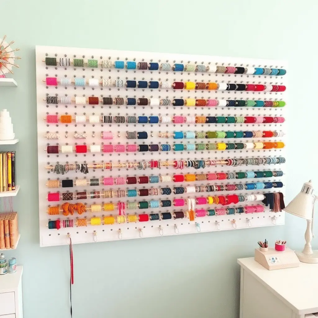 A pegboard mounted on a craft room wall transforms thread storage from a hidden drawer system into a vibrant, functional display. Install a sheet of pegboard on any available wall and fit it with small wooden dowels or metal spool pegs. Cones and large spools of machine embroidery thread sit beautifully on horizontal dowels, while loops of floss can be hung on hooks for easy access. The visual effect of neatly arranged threads sorted by color across an entire wall is genuinely striking, and the practical benefit of being able to grab any color at a glance without opening a single drawer is hard to overstate.
