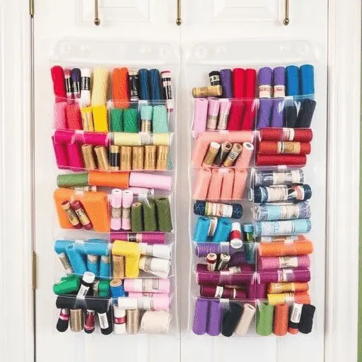 A clear plastic over-the-door shoe organizer is one of the most space-efficient embroidery thread organizer solutions for crafters who work in small rooms or shared spaces. Each pocket holds multiple skeins or bobbins sorted by color family, and the transparent material keeps everything visible. Hang the organizer on the back of a craft room door, a wardrobe door, or even a freestanding clothes rail for a storage solution that uses otherwise wasted vertical space. This approach works particularly well for larger collections and requires no drilling, no shelving, and minimal investment.