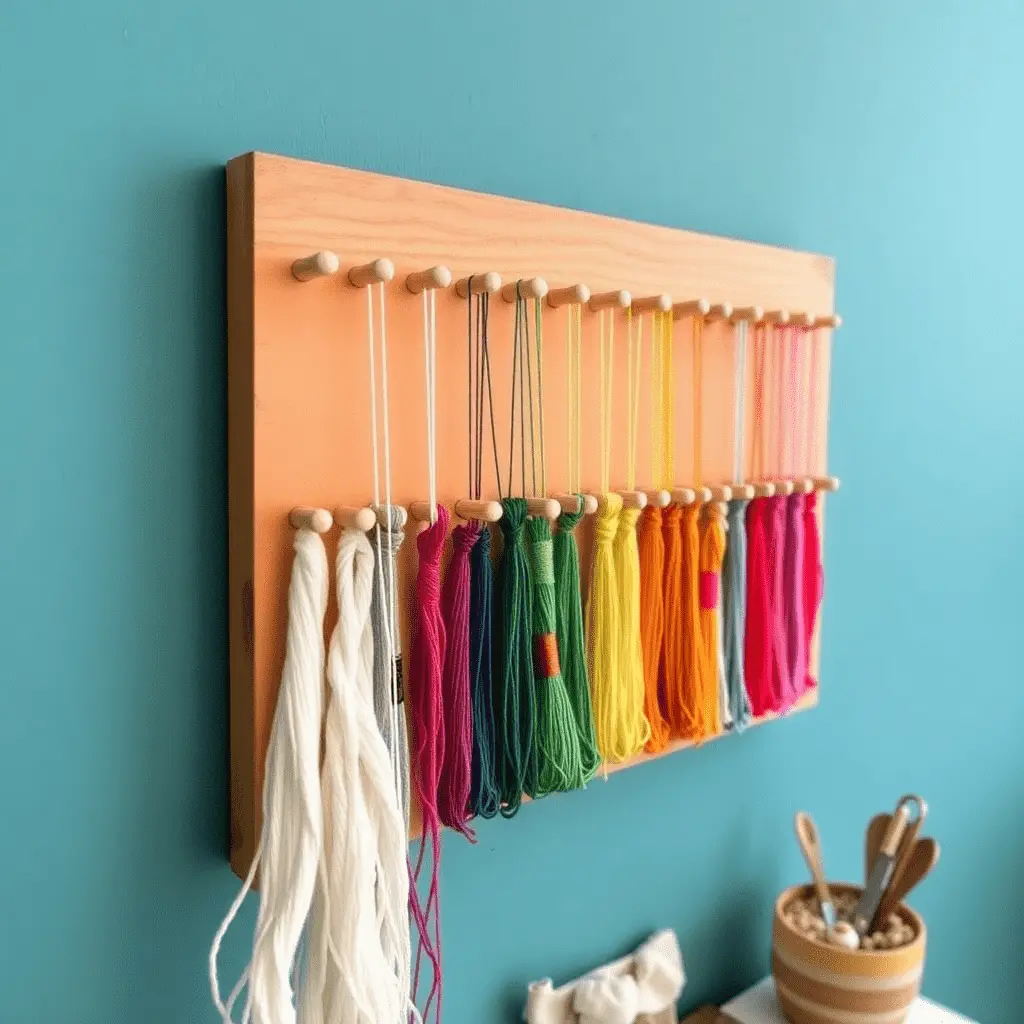 Hang skeins of thread directly over the dowels, sorting them by color family from left to right. Mount the board on the wall or prop it against a shelf for a storage solution that doubles as genuine wall decor. The warmth of the wood against the colors of the thread creates a display that looks deliberately decorative rather than purely functional.