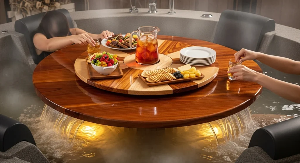 A rotating tabletop brings restaurant-style convenience to your hot tub experience. This clever design features a central pivot point that allows the entire surface to spin, making it easy to share items among multiple users. The rotation mechanism proves especially useful for larger hot tubs where reaching across creates difficulty.