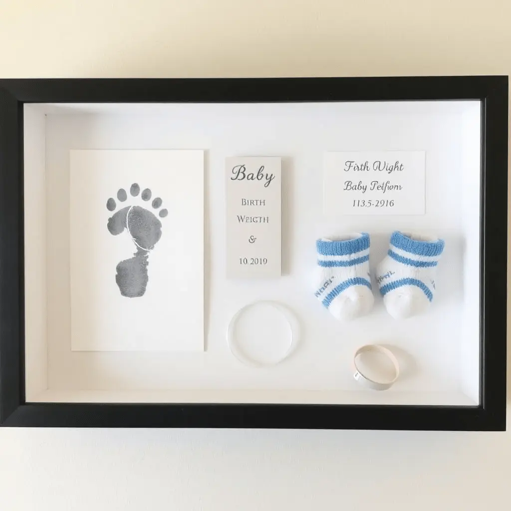 A shadow box display brings together multiple elements of a baby’s first months into a single framed presentation that any mother would be proud to hang on her wall. Press the baby’s footprint onto acid-free paper using ink or paint, add a small printed tag with the baby’s name, birth weight, and date, and arrange these alongside a tiny pair of socks or a hospital bracelet inside a deep shadow box frame. This is one of those Mother’s Day baby craft ideas that doubles as a first birthday keepsake and a piece of family history.