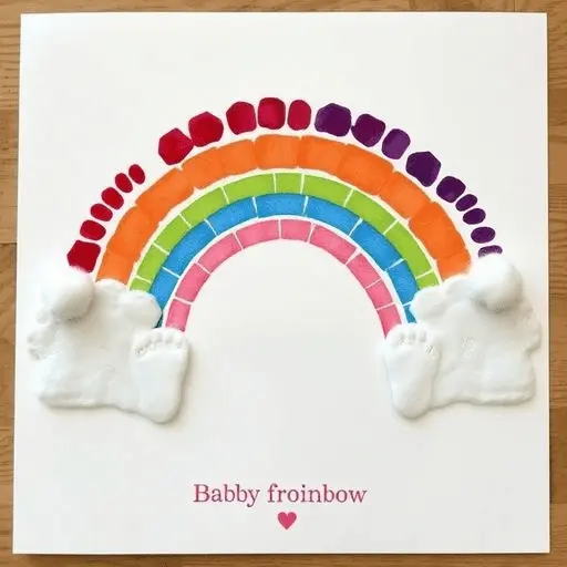 A rainbow made entirely from baby footprints is a joyful and colorful craft that suits infants of any age. Press each foot in a different color of the rainbow, red, orange, yellow, green, blue, and purple, arcing them across a large card to form the rainbow shape. Add cotton wool clouds at each end and a simple heartfelt message at the bottom. The layered footprints create a dense, textural rainbow effect that is far more charming and personal than any printed card available in a shop.