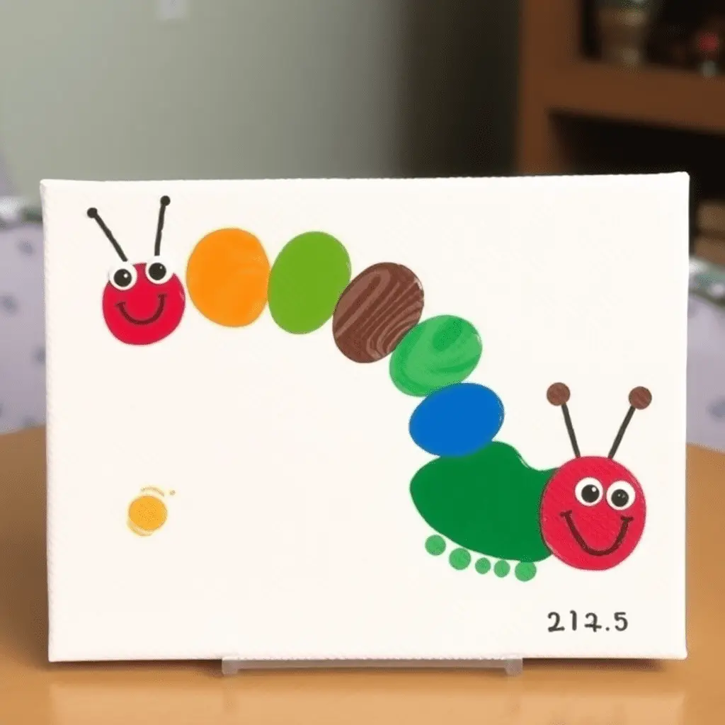A footprint caterpillar painted onto a small, stretched canvas makes a charming and colorful piece of nursery art that Mom will want to display long after Mother’s Day. Paint the baby’s foot in a bright color and press it sideways in a curving line across the canvas to form the caterpillar’s body segments. Add googly eyes, antenna made with a fine brush, and a sweet smile to the lead segment. Each foot impression becomes one body section, and the canvas can be dated and the baby’s name added as a finishing touch.