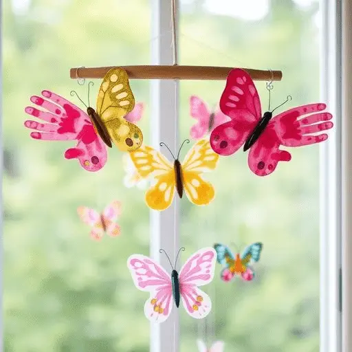 A mobile hanging above a crib or in a window made from handprint butterflies cut from card and painted in bright watercolors is a decorative craft that serves double duty as nursery decor and a Mother’s Day gift. Create each butterfly from two handprints positioned back-to-back, cut around the shape, decorate with patterns and details, and hang from a length of wooden dowel using varied thread lengths. The gentle movement of the mobile in a breeze gives the butterflies a lifelike quality that makes this one of the most visually captivating of all baby craft ideas for the occasion.