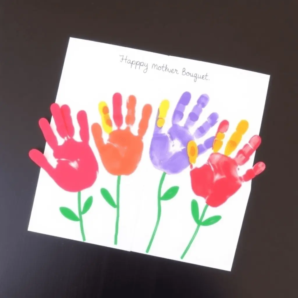 The handprint flower bouquet is perhaps the most beloved of all Mother’s Day baby craft ideas, and for very good reason. Paint the baby’s hand in bright, cheerful colors such as pink, red, purple, or yellow, and press it firmly onto a folded card with the fingers pointing upward to create the flower petals.