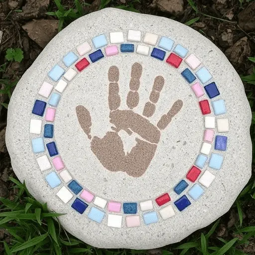A garden stone or paving slab decorated with a mosaic created from small tiles, glass pebbles, or broken china pieces, and featuring a central handprint impression in grout, makes a spectacular outdoor Mother’s Day gift. Press the baby’s hand into wet grout spread across the surface of the stone to create the central impression, then press small mosaic tiles into the remaining grout in a pattern around it. Allow to cure fully before placing in the garden. This is a craft that requires more preparation and adult involvement than most, but the finished result is genuinely stunning and practically indestructible.