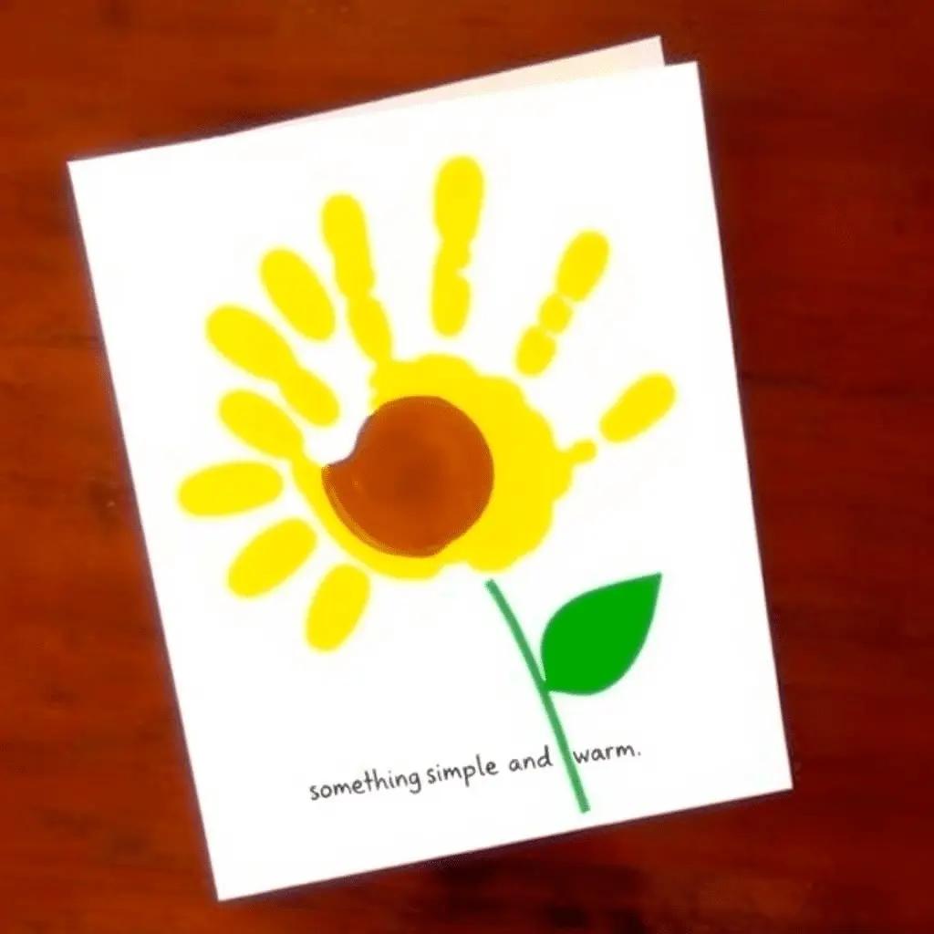 A sunflower made from a single handprint is bright, cheerful, and captures the warmth of the season perfectly. Paint the baby’s palm yellow and press it onto a card with the fingers spread wide to create the petals. Add a brown painted circle in the center using a finger dab, draw a green stem and two pointed leaves, and the sunflower is complete. A short message beneath the flower reading something simple and warm transforms this from an art piece into a card Mom will want to keep in a keepsake box forever.