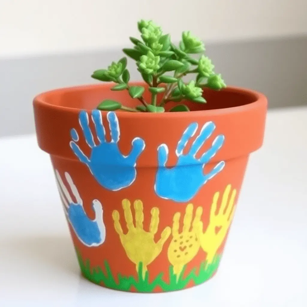 A plain terracotta pot transformed with baby handprints becomes a functional and deeply personal gift that Mom can fill with flowers, herbs, or succulents. Apply a base coat of paint to the pot and allow it to dry fully. Then press the baby’s hands around the exterior of the pot in contrasting colors, layering prints in rows or scattered patterns. Seal the finished pot with a clear non-toxic varnish and place a small plant inside for a gift that is both beautiful and immediately useful. This project works wonderfully for spring and summer Mother’s Day celebrations.
