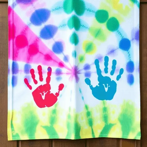 A tie-dyed tea towel featuring the baby’s handprints in fabric paint is a bright, cheerful, and kitchen-friendly gift that suits mothers who appreciate practical presents with a handmade touch. Tie-dye the towel first using a simple rubber band technique and fiber reactive dyes, allow it to cure and wash out, and then add the baby’s handprints across the surface using complementary fabric paint colors. The combination of the free-form tie-dye background and the deliberate handprint pattern produces a genuinely beautiful textile gift.