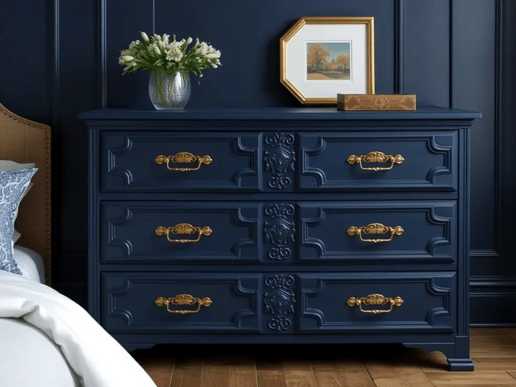 Deep navy blue is having a well-deserved moment in interior design, and a chest of drawers painted in this rich hue can anchor a bedroom with serious sophistication. Navy works especially well on larger pieces with architectural details such as carved handles or ornate drawer frames, where the depth of the color highlights every curve and edge. Pair it with brass or gold hardware for a look that feels both classic and current. Navy chest of drawers pieces work beautifully in master bedrooms, guest rooms, and even hallways where you want to create an immediate visual impact.