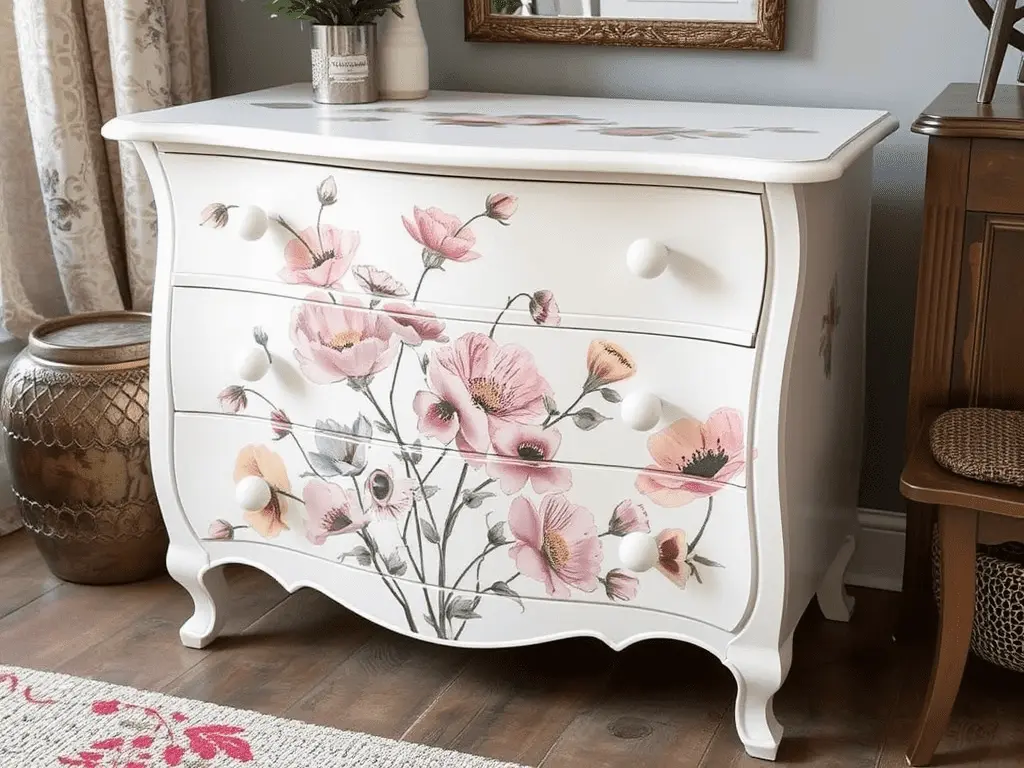 For those who enjoy a more artistic approach, hand-painting a floral design directly onto the surface of a chest of drawers can produce something truly one of a kind. Simple folk art-style blooms, delicate watercolor-effect florals, or bold botanical illustrations can be painted freehand or traced from a printed reference. This technique works well on a pale or neutral base so that the colors of the flowers pop. Chest of drawers with curved fronts and elegant legs are particularly well-suited to floral painting, as the shape of the piece echoes the organic nature of the design.