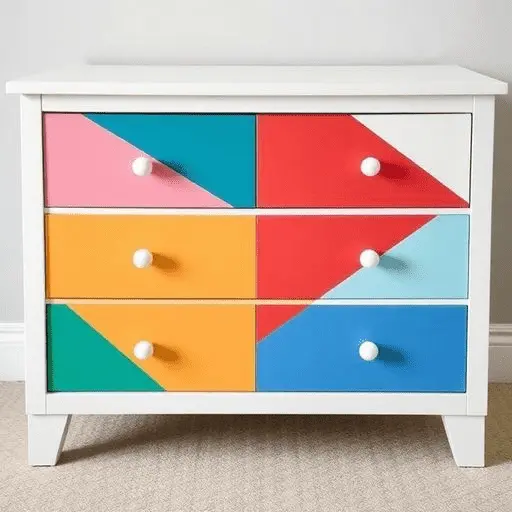 Using tape to create precise geometric sections across a chest of drawers and filling each section with a different color produces a bold, graphic result that feels both modern and playful. Triangles, diamonds, hexagons, and angular stripes are all popular choices for this technique. The key is using high-quality painter’s tape and removing it carefully while the paint is still slightly tacky to avoid peeling. Geometric painted chests suit contemporary bedrooms, children’s rooms, and home offices where you want to inject energy and visual movement into the space.