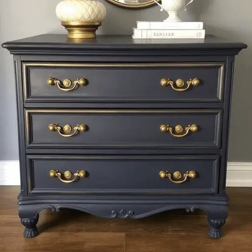 Rather than painting an entire chest in a metallic tone, one of the most elegant approaches is to use gold, bronze, or copper paint as a selective accent. This might mean painting just the drawer handles, the carvings, the feet, or a thin border around each drawer front in a metallic finish while leaving the main body in a solid matte or satin tone. The contrast between a deep charcoal or rich navy body and gold accents is particularly striking, evoking the feel of high-end designer furniture at a fraction of the cost.