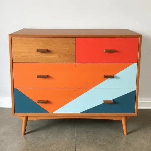 Taking inspiration from the clean lines and bold use of color that defined midcentury modern design, this approach uses angular paint sections to highlight or contrast the geometric structure of a chest of drawers. One popular interpretation involves leaving some areas of natural wood grain exposed while painting others in a single rich tone, creating a deliberate interplay between raw material and finished color. This technique works especially well on dressers and credenzas from the 1950s and 1960s, preserving their original character while giving them fresh visual energy.