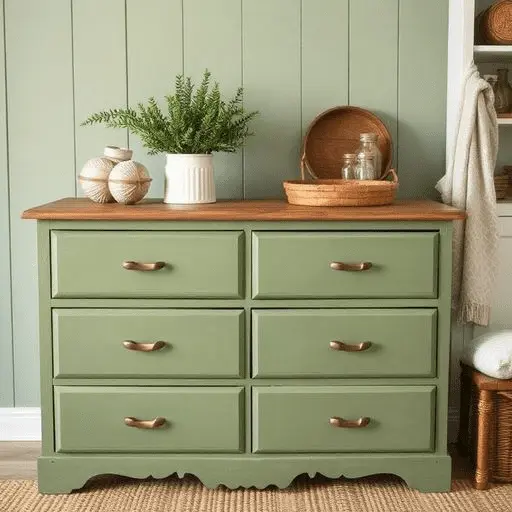 Earthy and nature-inspired greens have become a go-to choice for furniture makeovers, particularly in farmhouse and country-style interiors. Shades ranging from sage and olive to dusty eucalyptus and deeper moss create a grounded, organic feel on a painted chest of drawers. These tones pair beautifully with natural wood tops, aged brass hardware, and linen textures in the surrounding decor. A chalk or mineral paint in a muted green applied with a soft brush and finished with clear wax achieves that effortlessly handmade quality that makes this style so appealing.