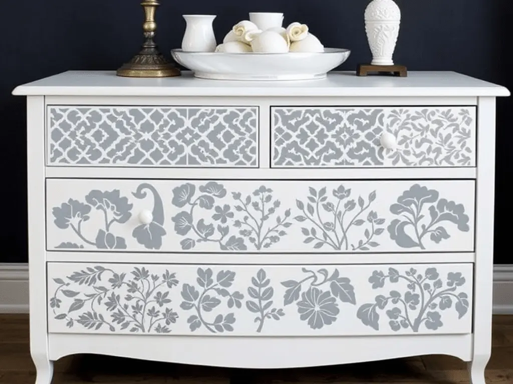 Stenciling is one of the most creative and cost-effective ways to add pattern and personality to a painted chest of drawers. Using adhesive stencils available at most craft stores, you can apply geometric shapes, Moroccan-inspired lattice patterns, damask motifs, botanical prints, or simple florals directly onto the drawer fronts. The key to a clean stencil is minimal paint on the brush and patience with repositioning. A white or light-colored base coat allows the stencil pattern to show up clearly, while a darker background gives the design a more dramatic and moody quality.