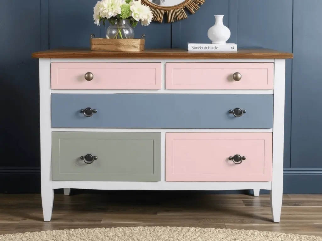 The ombre technique involves blending two or more shades of the same color family from light to dark across the surface of the chest, either vertically or across the drawer fronts from top to bottom. It is a striking and artistic approach that turns a piece of furniture into a true focal point. To achieve a clean ombre effect, wet blending with a dry brush between coats is key. Popular color progressions include pale sky blue into deep ocean, soft blush into bold terracotta, and mint green into deep emerald.