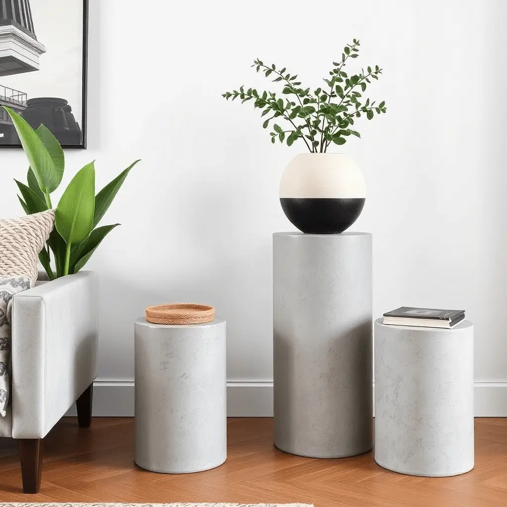 Concrete has firmly established itself as a premium material in contemporary interiors, and concrete pedestals bring a raw, architectural quality that suits industrial-modern and Scandinavian-inspired spaces particularly well. A concrete pedestal in a matte finish adds texture and visual mass without competing with surrounding elements. It pairs beautifully with leather, warm wood tones, and aged brass hardware. Top a concrete pedestal with a sculptural ceramic piece or a bold architectural plant, and you have a vignette that feels both rugged and refined.