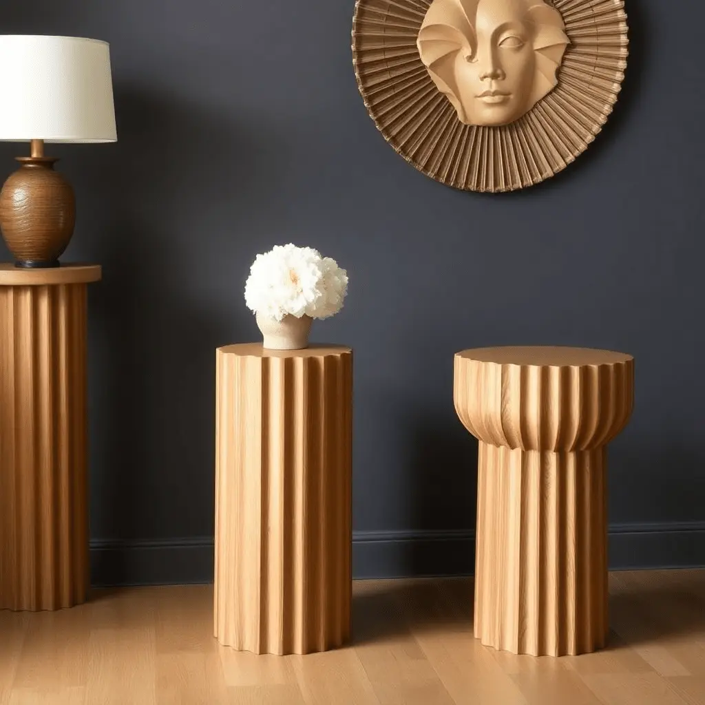 The fluted column is a design detail that has experienced a significant revival in modern interiors. A pedestal with vertical fluting in a warm wood finish brings immediate texture and organic warmth to a space. Unlike smooth, minimal columns, a fluted pedestal carries visual interest even before you place anything on top of it. In a living room or bedroom, it introduces a handcrafted quality that counters the sleekness of modern furniture. Oak, walnut, and white ash are particularly popular choices, each lending a slightly different character to the finished look.