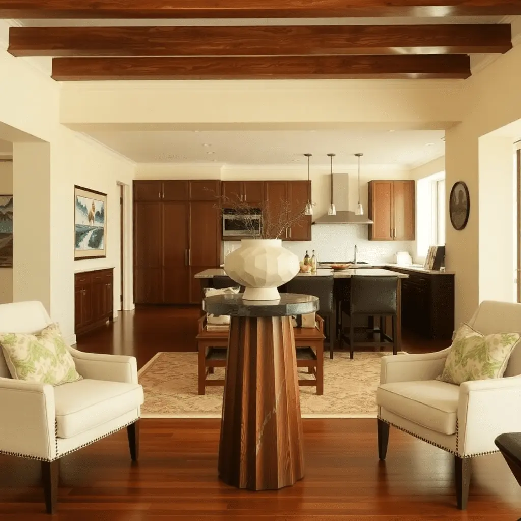 In an open-plan living area, a pedestal placed between the sitting area and the kitchen or dining zone does remarkable work. It fills transitional space, defines boundaries between zones without using walls or dividers, and introduces a sculptural element that anchors the room visually. A faceted stone pedestal or a fluted wood column works particularly well here, especially when topped with a large-format ceramic bowl or an organic sculptural form.