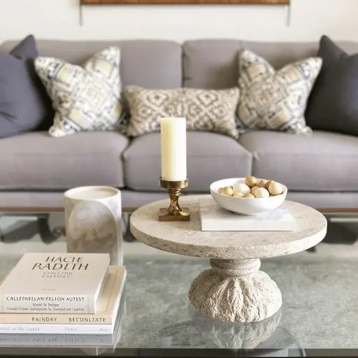 Not every pedestal needs to be tall. A low pedestal placed beside or within a coffee table arrangement introduces a subtle level change that makes a standard flat display more interesting. A low stone pedestal topped with a candle grouping, a single sculptural object, or a bowl of found objects adds depth to a coffee table vignette without overwhelming it. This is one of the simplest and most affordable ways to experiment with pedestal styling without committing to a large statement piece.