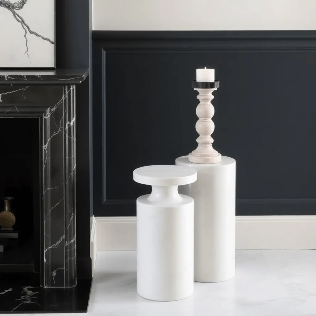 Marble is among the most enduring materials in interior design for good reason. A marble pedestal, whether in classic white Carrara, dramatic nero marquina, or warm travertine, brings immediate weight and elegance to any room. In a modern space, a marble pedestal works best when surrounded by restraint. Keep the room’s other surfaces and colors quiet, and allow the marble to do its work. Top it with a simple object, a single stem in a bud vase, a smooth stone sculpture, or a candle in an understated holder, and the result is effortlessly sophisticated.