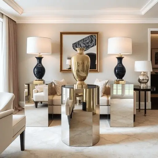 A mirrored pedestal reflects both light and the objects around it, creating depth and dimension in a room that might otherwise feel flat. In a living room or dining area, a mirrored pedestal topped with a striking vase or sculpture adds a glamorous, high-end quality that echoes the sensibility of luxury hotel interiors. It works particularly well in rooms with limited natural light, where the reflective surface amplifies whatever brightness is available.