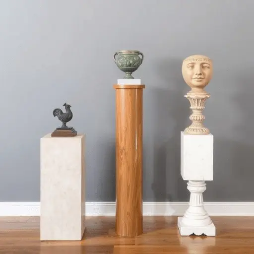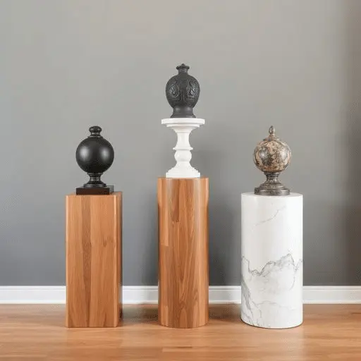 Knowing which pedestal to choose is just as important as knowing where to place it. As a general rule, taller pedestals work best in larger rooms with generous ceiling heights, while shorter pedestals suit compact spaces and tabletop arrangements. The object placed on top should be roughly one third to one half the height of the pedestal itself to maintain visual balance. In terms of material, match the pedestal to the dominant materials already present in the room, wood for warm, organic spaces, stone or concrete for cooler, more architectural environments, and metal or acrylic for strictly modern or minimalist interiors.