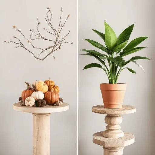 Because pedestals are freestanding and easy to restyle, they are ideal for seasonal decorating. In autumn, top a pedestal with a collection of gourds, dried seed heads, and warm-toned ceramics. In winter, a branch arrangement with subtle lighting and frosted pine creates immediate atmosphere. In spring and summer, fresh blooms in a tall vase or a lush tropical plant in a terracotta pot bring the season indoors. The pedestal itself stays constant while the styling changes, making it one of the most adaptable pieces in a well-designed home.