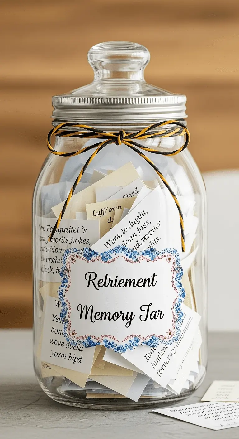 A retirement memory jar is as simple as it is touching. Collect short handwritten notes from everyone who wants to contribute, each sharing a favorite memory, an inside joke, a word of advice, or a warm wish. Place all the notes inside a beautifully decorated glass jar with a personalized label. When the retiree opens a note on a quiet afternoon, they are transported back to a moment, a laugh, or a gesture that shaped their career. It costs very little but delivers enormous emotional value.