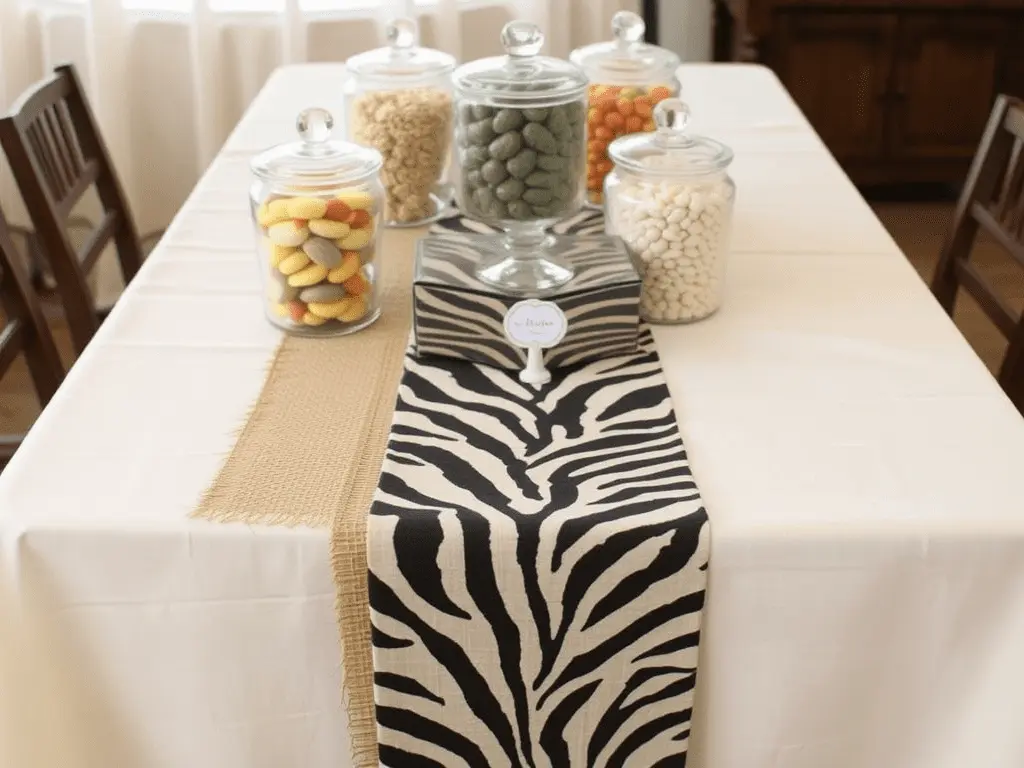 Using zebra print or leopard print linen as a narrow accent runner over a plain base cloth introduces bold and immediately recognizable safari animal references without overwhelming the other display elements. Applied in small, strategic doses, animal print linen adds personality and visual tension that keeps the table interesting from every viewing angle. https://www.etsy.com/market/stylish_safari_decor