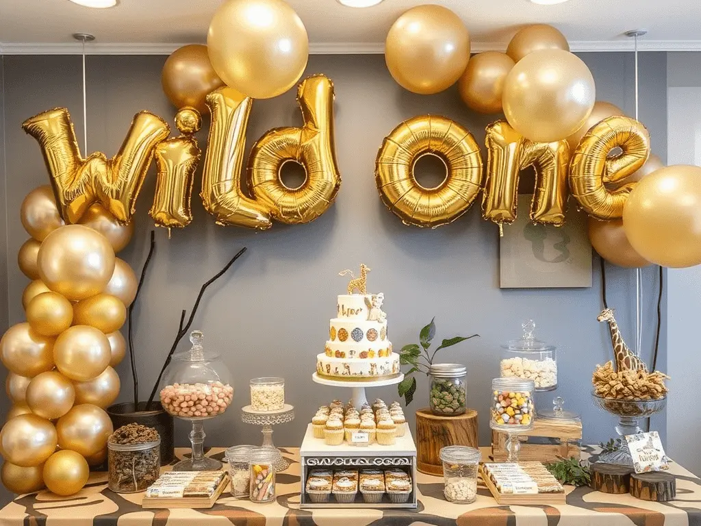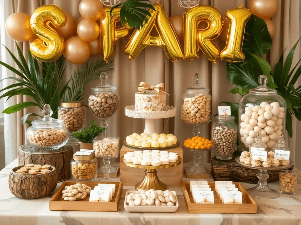 Adding metallic gold as a secondary accent color transforms the table from simply natural to genuinely glamorous. Gold foil balloon letters, gold rimmed candy jars, and gold printed food cards introduce richness and sophistication without disturbing the earthy foundation. This combination is currently among the most sought after safari candy table aesthetics and produces spectacular results in event photography.