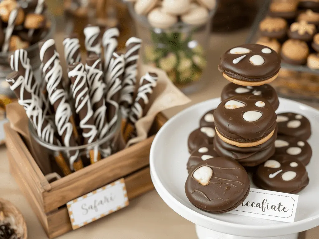 Pretzel rods dipped in dark or milk chocolate and decorated with white chocolate animal print drizzle are visually impressive and delicious. Arrange them upright in a tall glass jar or display them flat in a wooden crate lined with parchment paper. The deep brown tone of chocolate covered pretzels fits naturally into the safari color palette without any additional styling effort.